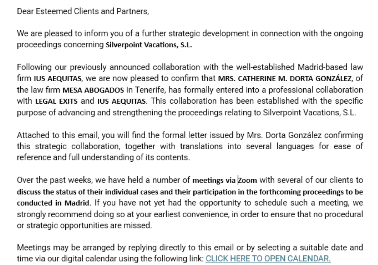 Following our previously announced collaboration with the well-established Madrid-based law firm IUS AEQUITAS, we are now pleased to confirm that MRS. CATHERINE M. DORTA GONZÁLEZ, of the law firm MESA ABOGADOS in Tenerife, has formally entered into a professional collaboration with LEGAL EXITS and IUS AEQUITAS. This collaboration has been established with the specific purpose of advancing and strengthening the proceedings relating to Silverpoint Vacations, S.L.
